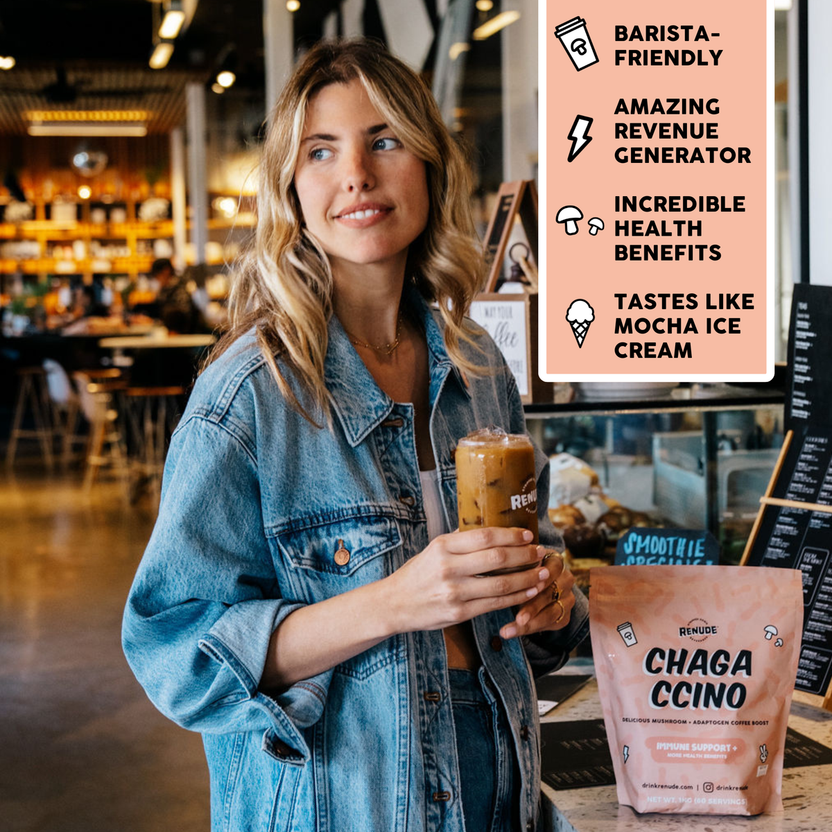 Made with wild-foraged chaga, cacao, cinnamon, vanilla, and monk fruit, this natural blend will have your customers lining up for more. Join cafes who earn $3k+ per month selling the Chagaccino and add this IG-worthy drink to your lineup!